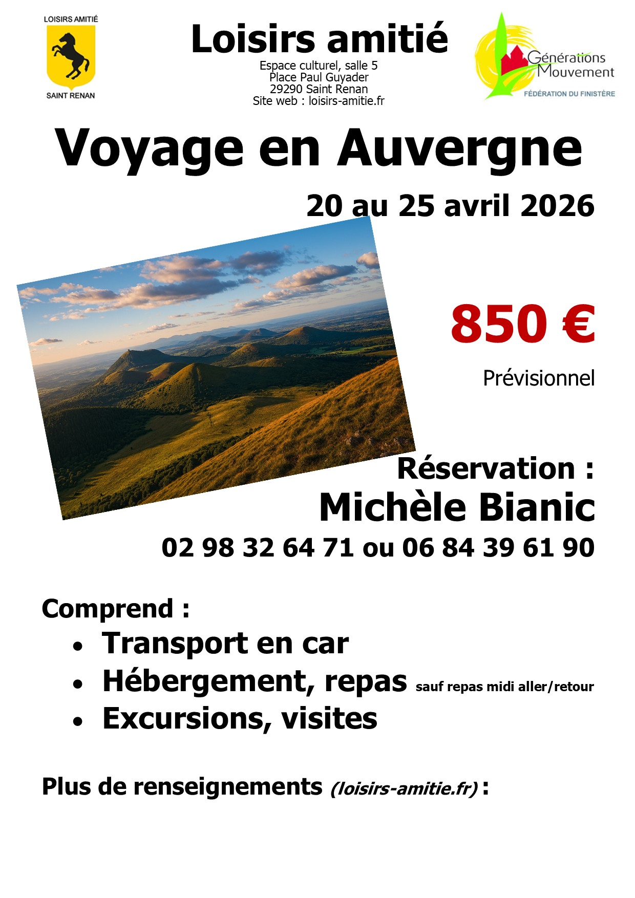 Loisirs amitié organise, du 20 au 25 avril 2026, un voyage en Auvergne, basé au VTF le domaine des Puys Auvergne à Saint Sauves, 63950 (le site présente le VTF en hiver, il n’y a pas de neige fin avril…)